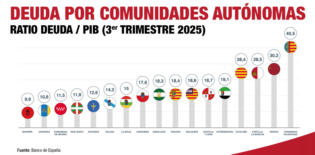 - Comunidad Valenciana: lidera el ranking de deuda con un preocupante 40,5% del PIB.