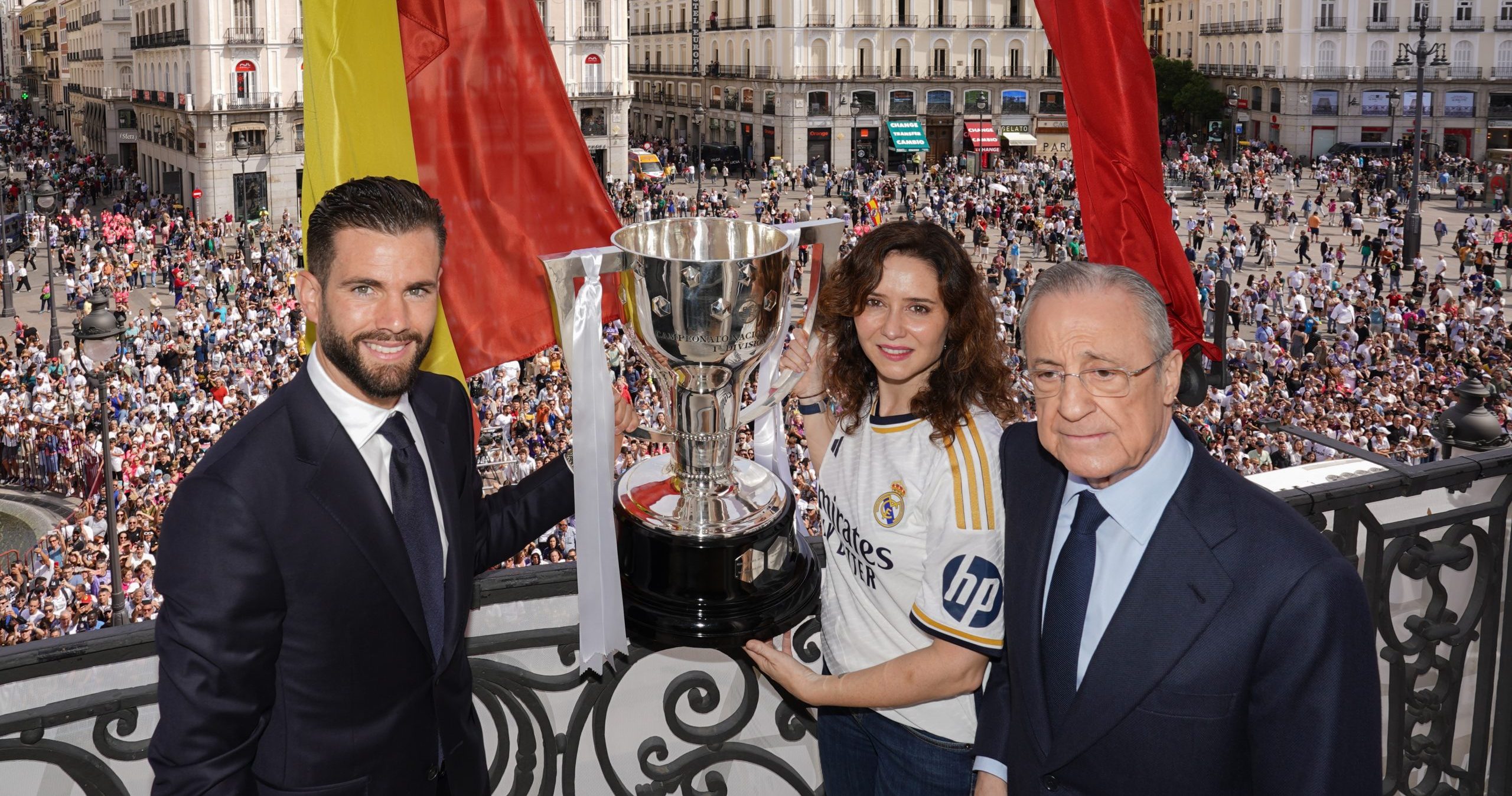 La presidenta regional ha acompañado a jugadores, cuerpo técnico y directivos del club, que han salido al balcón principal de la sede del Ejecutivo autonómico para celebrar la consecución del título liguero con los aficionados blancos en la Puerta del Sol. “Gracias por tanto, por hacerlo por tantos niños, jóvenes, mayores y tantas personas que cuando pasen los años podrán decir yo vi ganar al Real Madrid su trigésimo sexto título de Liga y en pocos días hizo historia con su decimoquinta Champions”, ha concluido.