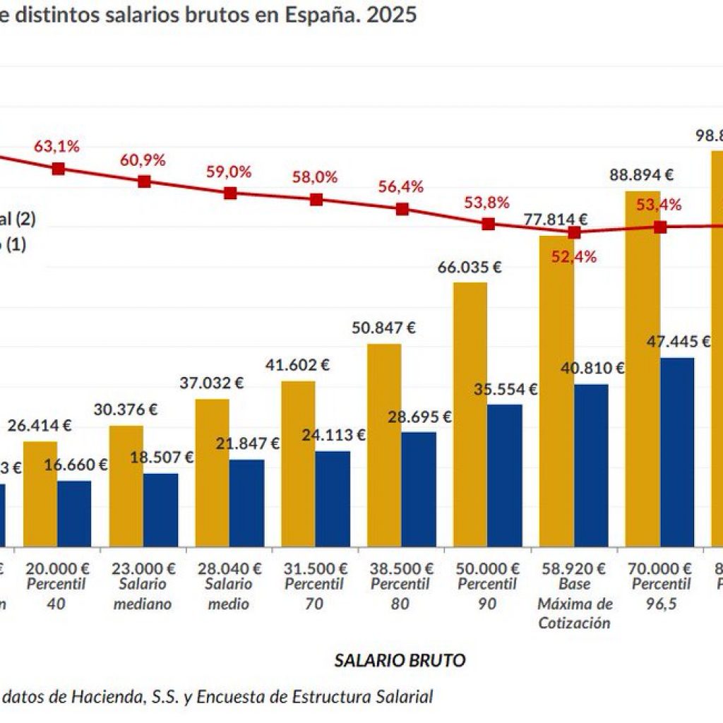 La gráfica, elaborada a partir de datos de Hacienda y la Encuesta de Estructura Salarial, compara el coste laboral con el salario neto para diferentes niveles salariales, y revela un patrón constante: cuanto mayor es el salario bruto, menor es el porcentaje que realmente llega al trabajador. En el caso del salario mediano (23.000 € brutos), el empleado solo percibe 18.507 € netos, quedando un 39% en manos del Estado vía IRPF y cotizaciones. Esta proporción es aún más desfavorable si se tienen en cuenta los impuestos indirectos que afectan a todos los ciudadanos por igual, sin tener en cuenta su renta real.